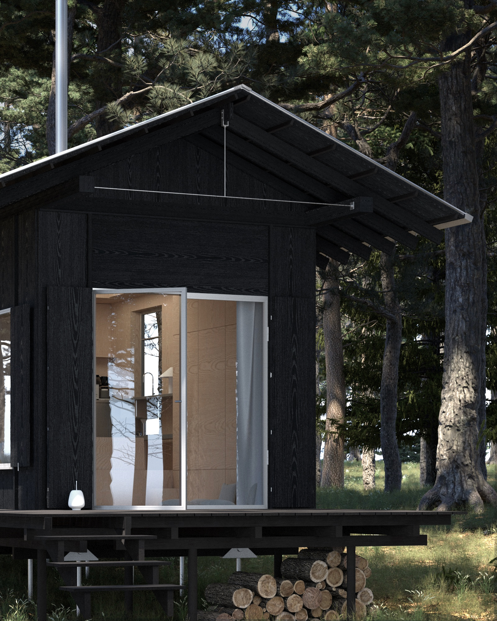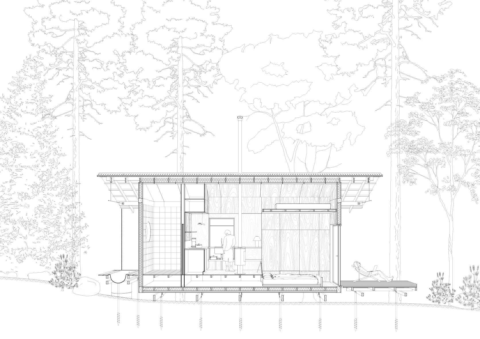 The building’s minimal footprint is contrasted with a spacious interior, allowing for a comfortable, yet minimal living. The main space can be used in a flexible way at different times, supported by space-saving solutions. With limited furnishings, the cabin encourages lighter, rudimental ways of inhabitation and co-existence with the surrounding nature.