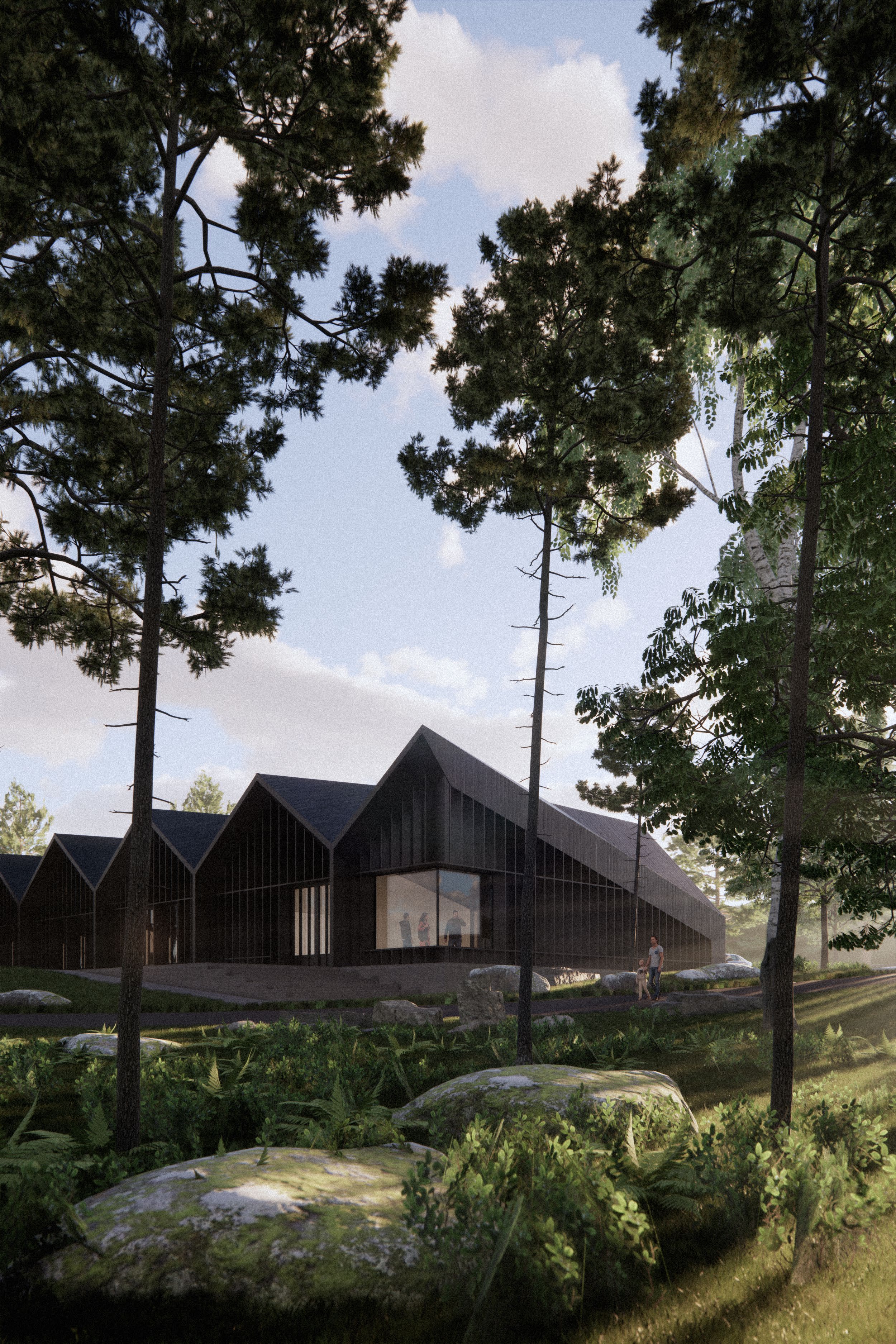 The way the roof folds defines and organises the spaces, inhabited by the different functional uses. The roof structure is made with standardised panel sizes to minimise the use of material. The folding roofscape breaks down the mass of the building and provides flexible, support-free workspaces. The building's facades reflect the language of folding, providing continuity and hinting at the structure within. The outside of the workshop has been charred black to protect the timber, while the natural colour of the timber remains visible on the inside, where the construction of the folded roof is fully on display.